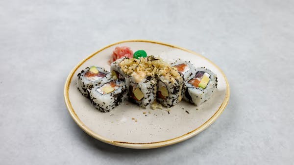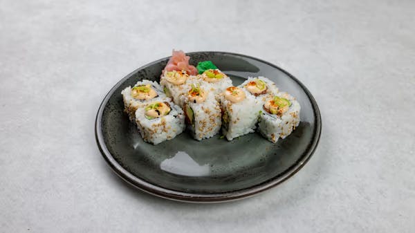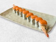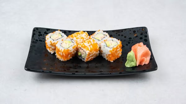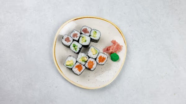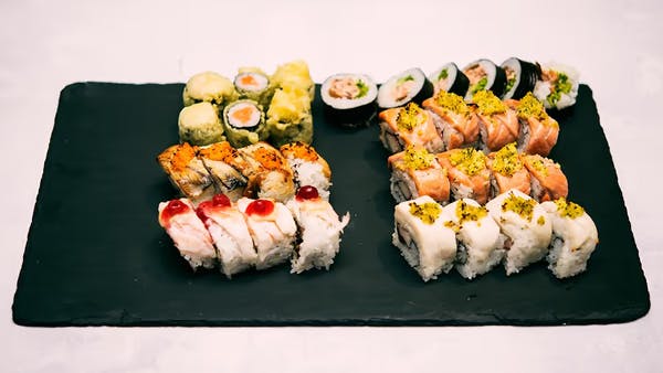 6 nigiri, 12 hosomaki, 16 uramaki: 2 kom tuna nigiri, 2 kom losos nigiri, 2 kom kozice nigiri, 3 kom hosomaki tuna, 3 kom hosomaki losos, 3 kom hosomaki avocado, 3 kom hosomaki krastavac, 4 kom California uramaki, 4 kom Boston uramaki, 4 kom Philadelphia uramaki, 4 kom hrskava tempura
